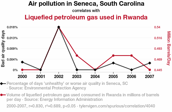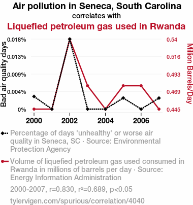 - The spurious research paper: Gas and Air Connections: Analyzing the Relationship Between Liquefied Petroleum in Rwanda and Air Pollution in Seneca, South Carolina