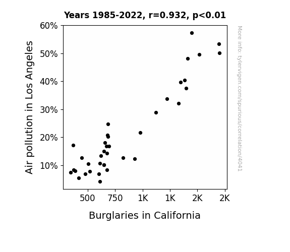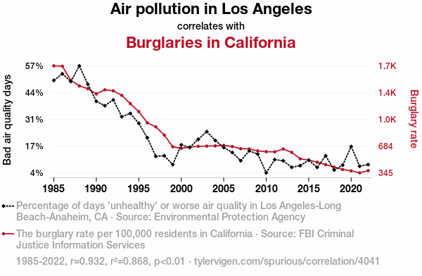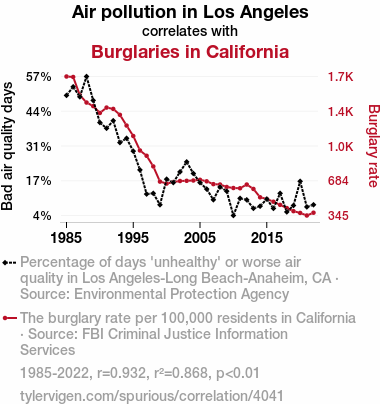 A linear line chart with years as the X-axis and two variables on the Y-axis. The first variable is Air pollution in Los Angeles and the second variable is Burglaries in California.  The chart goes from 1985 to 2022, and the two variables track closely in value over that time. Small Image