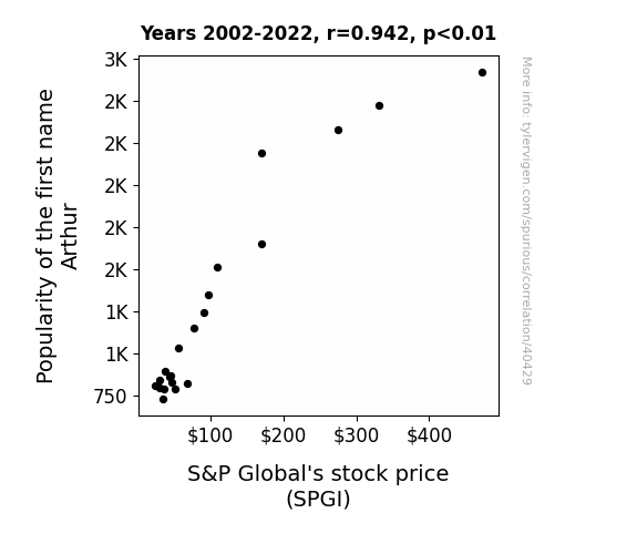 This means 88.8% of the change in the one variable (i.e., S&P Global's stock price (SPGI)) is predictable based on the change in the other (i.e., Popularity of the first name Arthur) over the 21 years from 2002 through 2022.