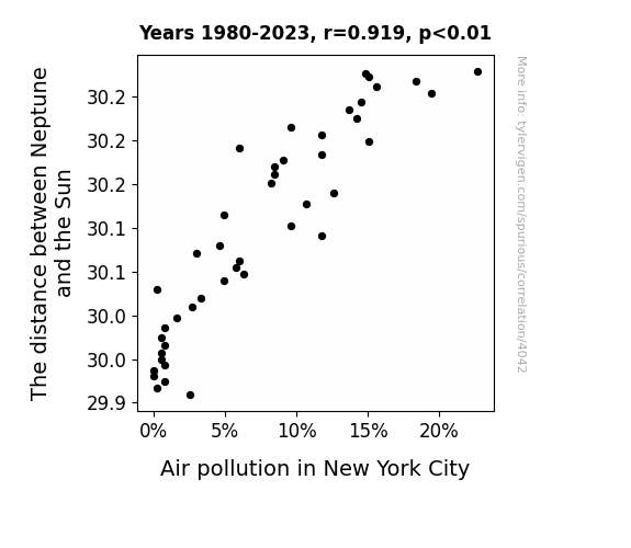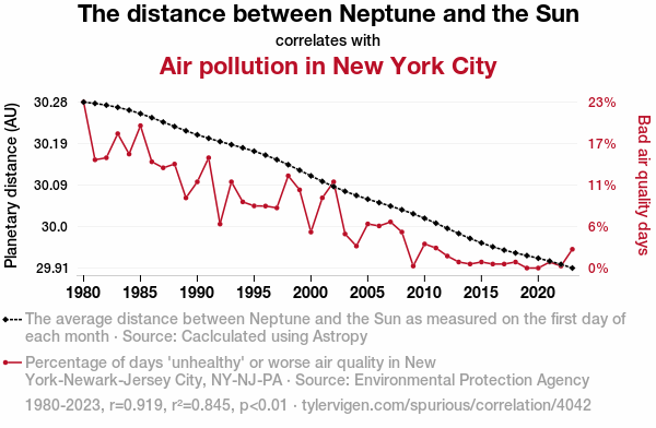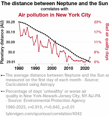 This means 84.5% of the change in the one variable (i.e., Air pollution in New York City) is predictable based on the change in the other (i.e., The distance between Neptune and the Sun) over the 44 years from 1980 through 2023.