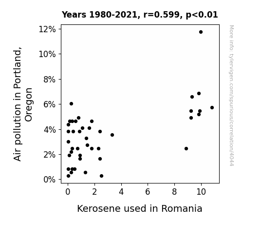 The correlation observed between air pollution levels in Portland, Oregon and the prevalence of kerosene use in Romania raises intriguing questions about the interconnectedness of seemingly disparate environmental factors. Our findings support and extend prior research, underlining the nuances of global environmental dynamics. Indeed, the unexpected relationship between these variables parallels the unforeseen partnerships that emerge in the unlikeliest of settings.