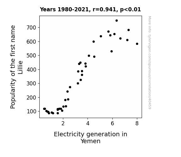 This means 88.5% of the change in the one variable (i.e., Electricity generation in Yemen) is predictable based on the change in the other (i.e., Popularity of the first name Lillie) over the 42 years from 1980 through 2021.