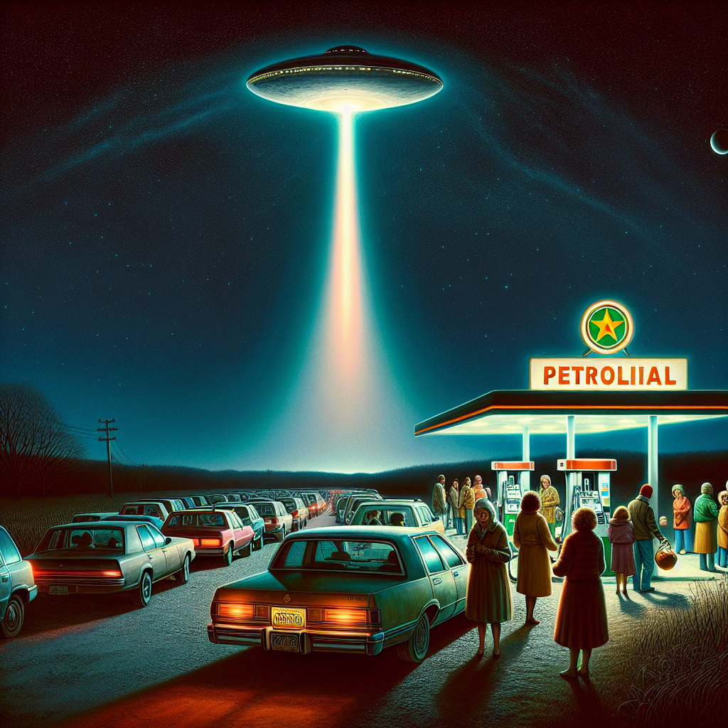 ChatGPT: In a rural Pennsylvania town, a line of cars stretches out from a busy gas station as people hurriedly fill up their tanks. Overhead, a bright light streaks across the night sky, marking another UFO sighting in the area. The glowing sign of the gas station reads "Angola Petroleum," symbolizing the interconnection of extra-terrestrial energy demand and the connection to Angola's petroleum consumption.