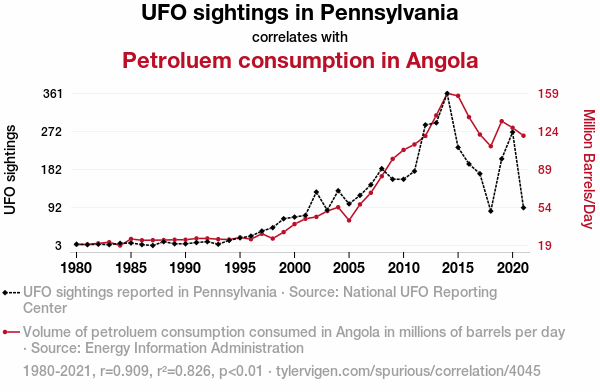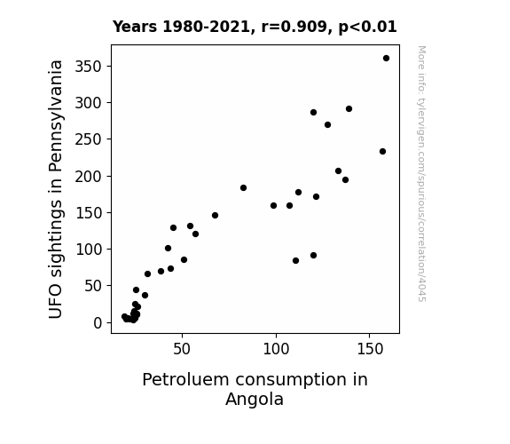 - The spurious research paper: Unidentified Flammable Objects: Exploring the Connection Between UFO Sightings in Pennsylvania and Petroleum Consumption in Angola