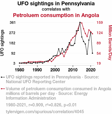 This means 82.6% of the change in the one variable (i.e., Petroluem consumption in Angola) is predictable based on the change in the other (i.e., UFO sightings in Pennsylvania) over the 42 years from 1980 through 2021.