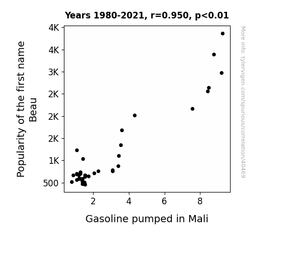 This means 90.3% of the change in the one variable (i.e., Gasoline pumped in Mali) is predictable based on the change in the other (i.e., Popularity of the first name Beau) over the 42 years from 1980 through 2021.