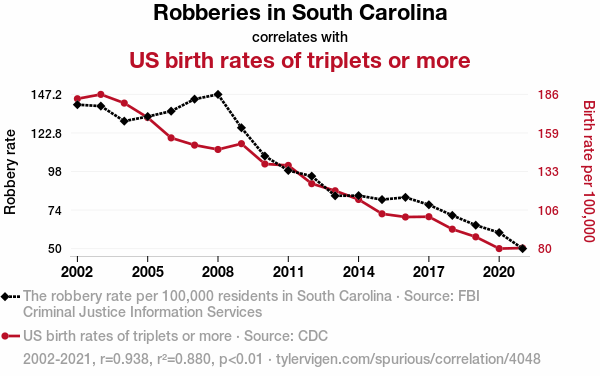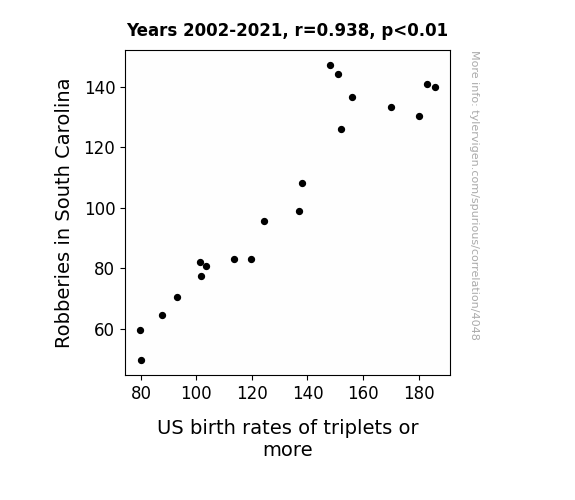 - The spurious research paper: The Great Caper: Investigating the Link between Robberies in South Carolina and the Birth Rate of Triplets or More in the United States