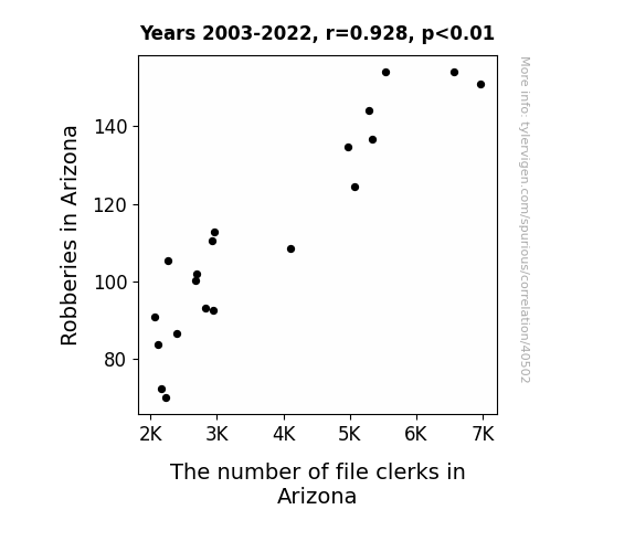 This means 86.2% of the change in the one variable (i.e., The number of file clerks in Arizona) is predictable based on the change in the other (i.e., Robberies in Arizona) over the 20 years from 2003 through 2022.