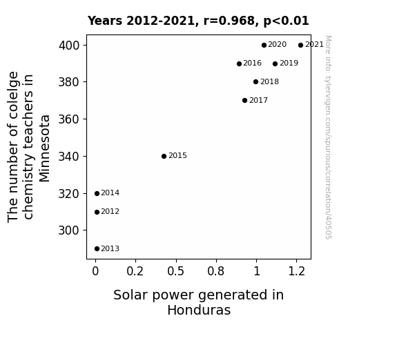 This means 93.6% of the change in the one variable (i.e., Solar power generated in Honduras) is predictable based on the change in the other (i.e., The number of colelge chemistry teachers in Minnesota) over the 10 years from 2012 through 2021.