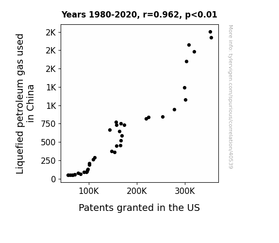 This means 92.6% of the change in the one variable (i.e., Patents granted in the US) is predictable based on the change in the other (i.e., Liquefied petroleum gas used in China) over the 41 years from 1980 through 2020.