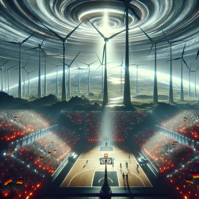 ChatGPT: An image that looks like it is a scene from 'Star Wars' where a basketball arena, transformed into a futuristic space colosseum, is showcased. Within the arena, fans cheer and generate winds with their enthusiasm, causing the surroundings to glimmer with energy. The gusts of wind sweep beyond the arena, intertwining with a landscape of towering, sleek wind turbines in Germany. The turbines spin vigorously, capturing the energy from the fans and seamlessly transforming it into sustainable wind power.