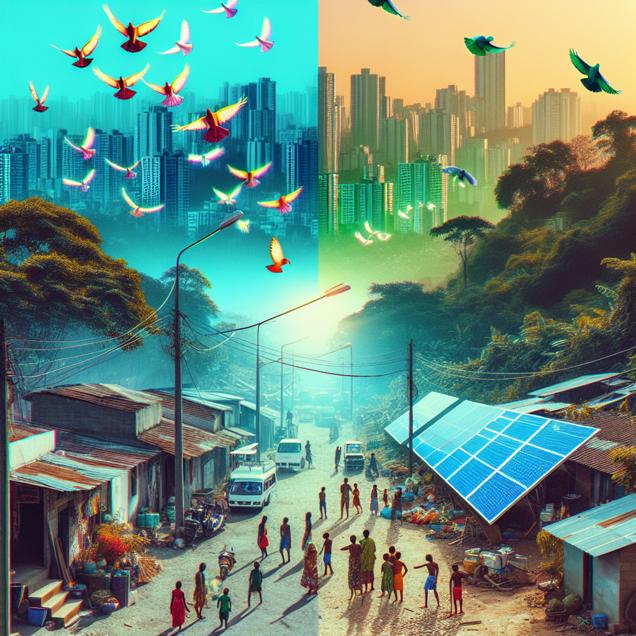 Prompt: Prompt: Generate an image that embodies the contrast between a bustling Chicago neighborhood and a serene Peruvian village as they transition to eco-friendly practices. In the Chicago scene, showcase the dispersing smog and the vibrant eco-friendly pigeons taking flight amidst the clearing air. In the Peruvian village, depict the locals gathered around a newly installed solar panel, showcasing their transition from kerosene lamps to the warm glow of sustainable energy. Emphasize the harmony between urban and rural environments embracing eco-friendly solutions. Use glitch art to create a surreal, visually striking representation of these contrasting scenes. The depiction should include only scenes, people, and objects, it should not include text or speech bubbles.