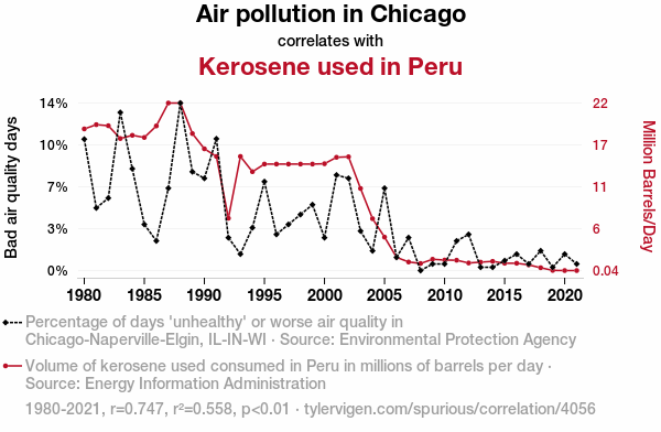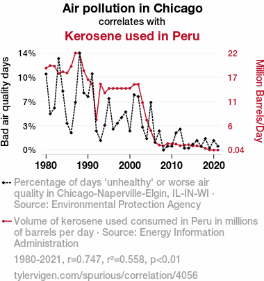 - The spurious research paper: A Burning Connection: Unearthing the Surprising Relationship Between Air Pollution in Chicago and Kerosene Usage in Peru