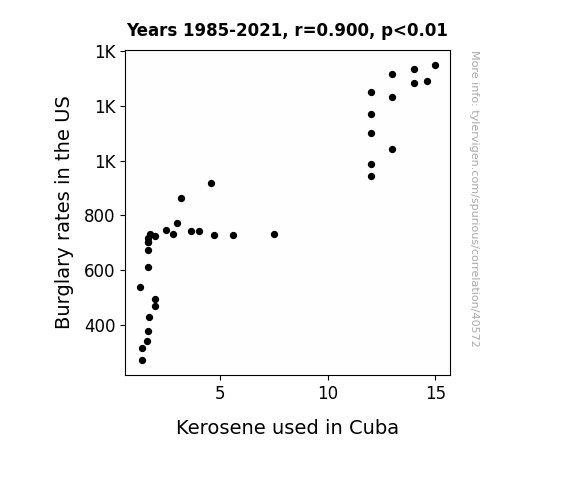 This means 81% of the change in the one variable (i.e., Kerosene used in Cuba) is predictable based on the change in the other (i.e., Burglary rates in the US) over the 37 years from 1985 through 2021.