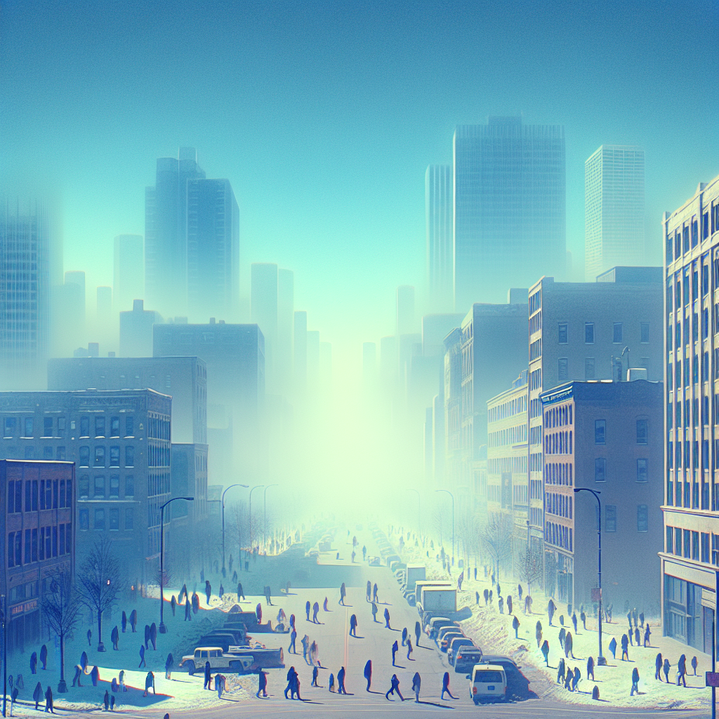 Prompt: [ A photo-realistic image ] Generate an image depicting a clear blue sky above Janesville, Wisconsin, gradually becoming hazier with fewer and fewer Alysias walking the streets. The city's atmosphere seems trapped as evident by the air pollution, making it difficult for the breeze to clear it away. The scene should convey a sense of stillness and unease as the Alysias become increasingly scarce in the city. The depiction should include only scenes, people, and objects, it should not include text or speech bubbles.