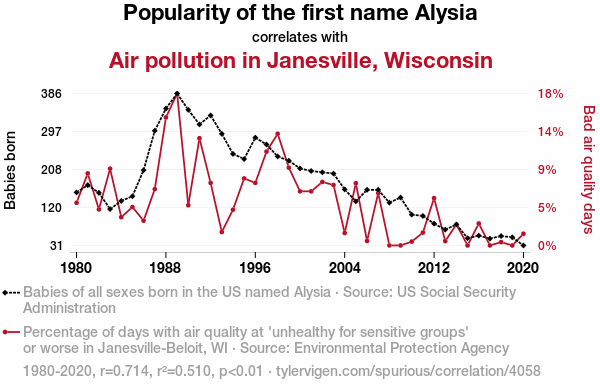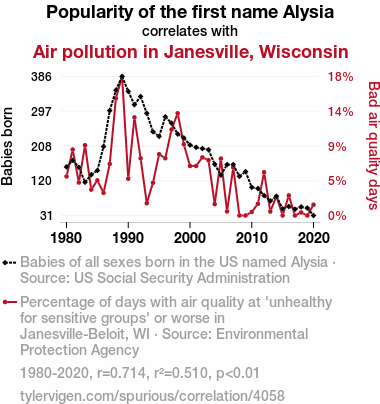 Alysia, popularity, air pollution, Janesville, Wisconsin, correlation, US Social Security Administration, Environmental Protection Agency, analysis, 1980-2020, correlation coefficient, p-value, environmental research, social demographics
