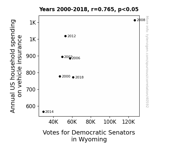 This means 58.5% of the change in the one variable (i.e., Votes for Democratic Senators in Wyoming) is predictable based on the change in the other (i.e., Annual US household spending on vehicle insurance) over the 7 years from 2000 through 2018.