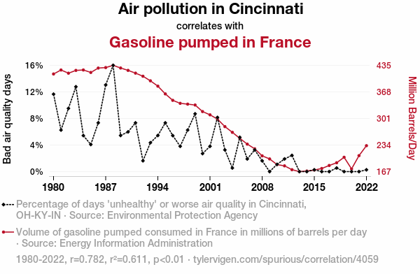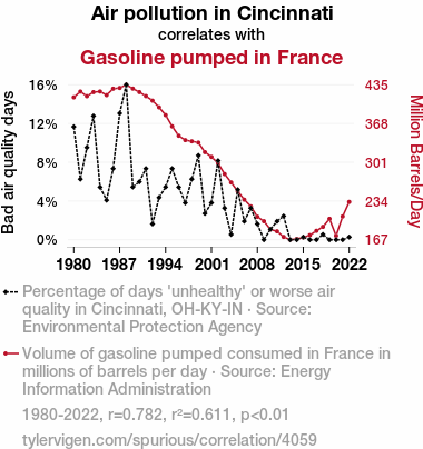A linear line chart with years as the X-axis and two variables on the Y-axis. The first variable is Air pollution in Cincinnati and the second variable is Gasoline pumped in France.  The chart goes from 1980 to 2022, and the two variables track closely in value over that time. Small Image