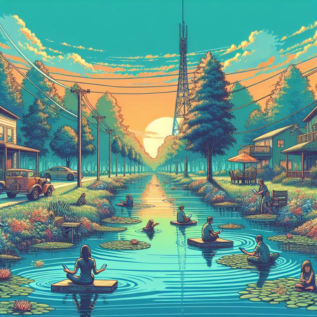Prompt: Create an image of a serene landscape in Dayton, with clear blue skies and reduced air pollution. Against this backdrop, depict residents looking frustrated as they struggle with clear communication on their Frontier Communications devices due to increased static and interference. Capture the contrast between the beautiful, pollution-free environment and the heightened dissatisfaction with the service. The depiction should include only scenes, people, and objects, it should not include text or speech bubbles.
