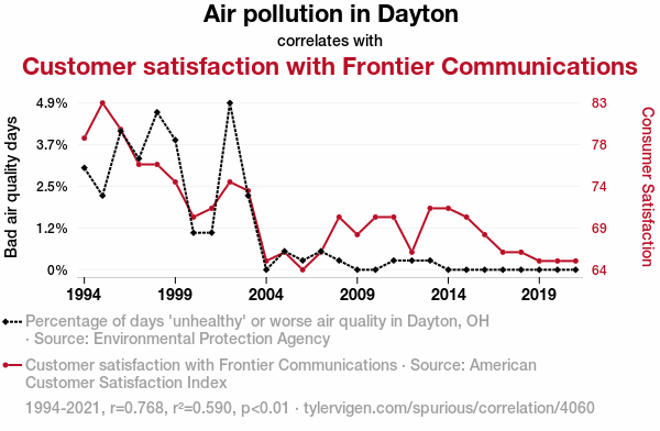 This means 59% of the change in the one variable (i.e., Customer satisfaction with Frontier Communications) is predictable based on the change in the other (i.e., Air pollution in Dayton) over the 28 years from 1994 through 2021.
