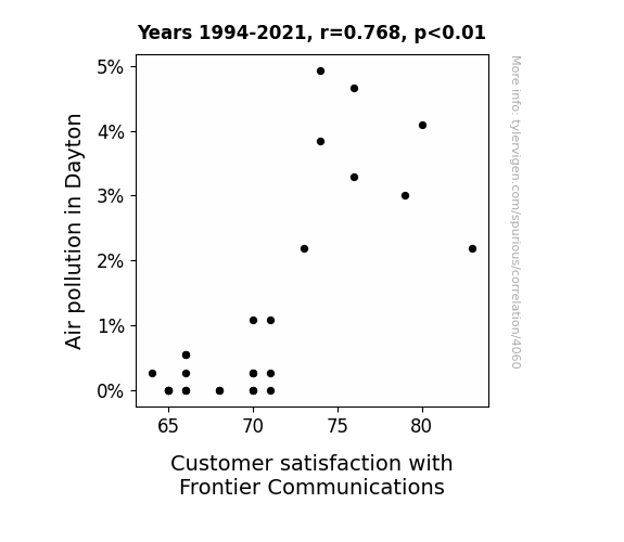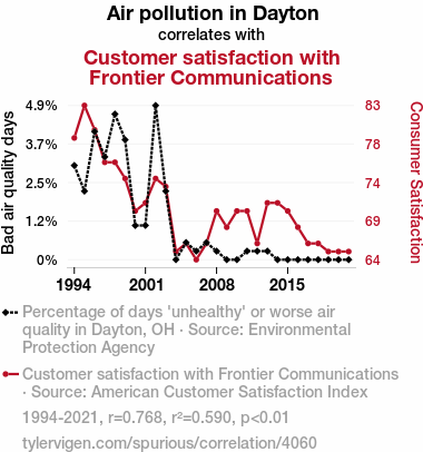 User prompt: Please make up a funny explanation for how a decrease in Air pollution in Dayton caused Customer satisfaction with Frontier Communications to decrease. Add a funny one-liner at the end.