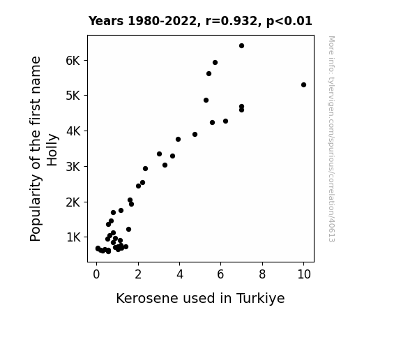 This means 86.9% of the change in the one variable (i.e., Kerosene used in Turkiye) is predictable based on the change in the other (i.e., Popularity of the first name Holly) over the 43 years from 1980 through 2022.
