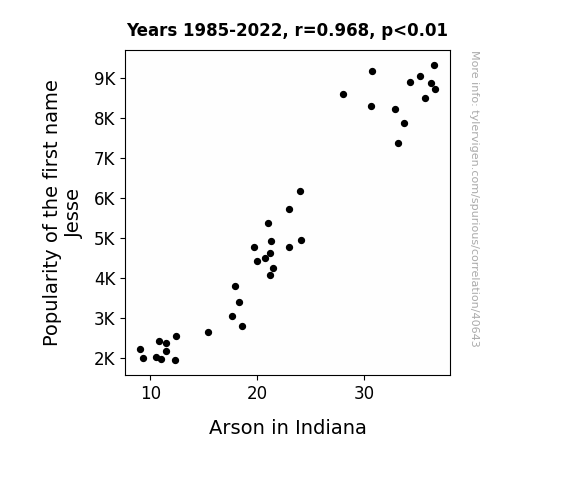 This means 93.7% of the change in the one variable (i.e., Arson in Indiana) is predictable based on the change in the other (i.e., Popularity of the first name Jesse) over the 38 years from 1985 through 2022.
