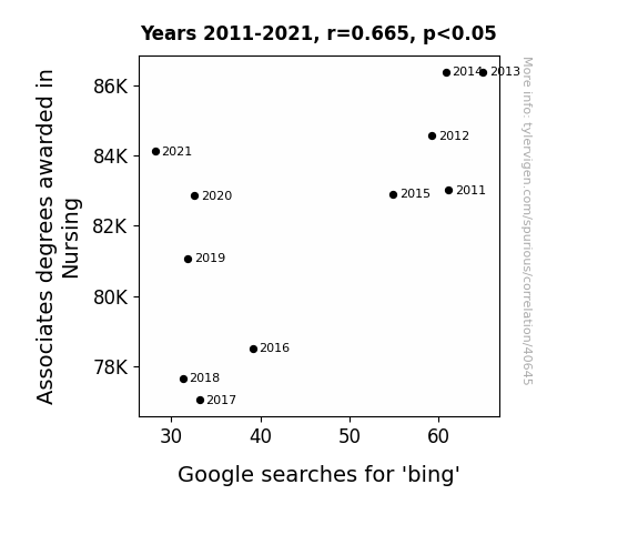 This means 44.2% of the change in the one variable (i.e., Google searches for 'bing') is predictable based on the change in the other (i.e., Associates degrees awarded in Nursing) over the 11 years from 2011 through 2021.