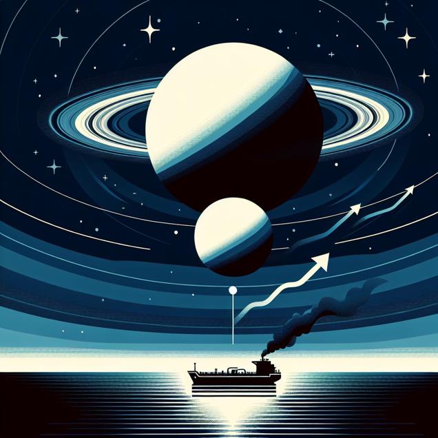 ChatGPT: Generate an image of a minimalist space scene with a focus on Neptune and Uranus orbiting in the distance. The Earth subtly shifting on its axis should be shown with global wind patterns changing. A simple representation of Chevron's oil tankers at sea should be included, with the decreased air resistance aiding in more efficient fuel consumption. Finally, visualize the impact of this efficiency by indicating an increase in Chevron's stock price on a trading board, maintaining a clean and minimalist style throughout the entire image.