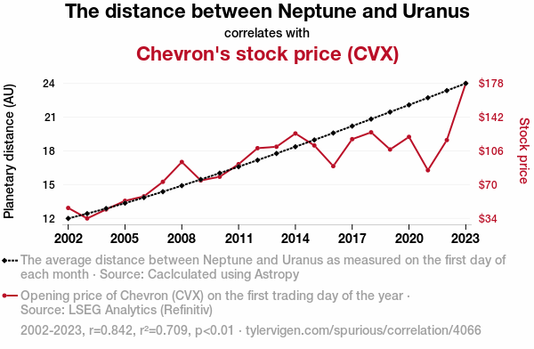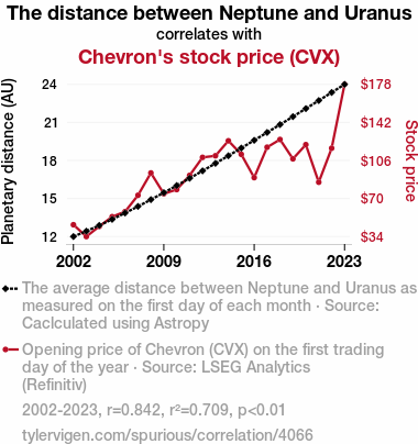 ChatGPT: In the vast expanse of space, Neptune and Uranus orbit in their distant celestial dance, with the increasing distance between them causing a gentle gravitational pull on the Earth. As the Earth subtly shifts on its axis, global wind patterns change, creating a decrease in air resistance for Chevron's oil tankers at sea. This allows for more efficient fuel consumption, leading to higher profit margins for Chevron, reflected in an increase in their stock price on the trading board.