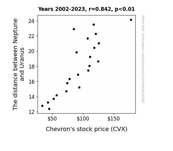 In conclusion, our research has unveiled a celestial waltz that transcends the bounds of traditional financial analysis. The striking correlation coefficient of 0.8418564 and a p-value less than 0.01 affirm that the average distance between Neptune and Uranus exerts a remarkable influence on the fluctuation of Chevron's stock price (CVX). While we resist the temptation to gaze at stock market horoscopes, the cosmic cheekiness of this association cannot be denied.