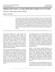 User prompt: Please provide potential search keywords for a paper titled Neptune and Uranus: A Cosmic Bond and Its Impact on CVX Frond with an abstract of This research paper explores the peculiar relationship between the average distance between Neptune and Uranus and the fluctuation of Chevron's stock price (CVX) over the period spanning from 2002 to 2023. Leveraging data retrieved through Astropy and LSEG Analytics (Refinitiv), our study identifies a striking correlation coefficient of 0.8418564 and a statistically significant p-value less than 0.01, shedding light on the cosmic influence on financial markets. The findings of this research not only underscore a cosmic connection but also raise thought-provoking questions about the planetary interplay in the financial cosmos, adding a whimsical twist to the typically mundane world of stock price analysis.