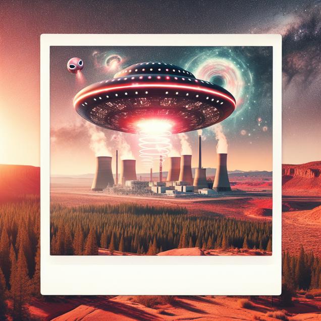 ChatGPT: Generate an image depicting a Polaroid photo capturing the surreal scene of a UFO hovering above the red rock landscape of the Utah desert, with its otherworldly lights casting an eerie glow. In the background, show a dense forest of trees in Portugal standing in silhouette against the setting sun. Additionally, depict a massive biomass power plant with smokestacks emitting billows of energy, indicating heightened activity and a surge in power generation. The composition should be visually striking, ensuring a sense of otherworldly mystery and natural beauty coexisting.