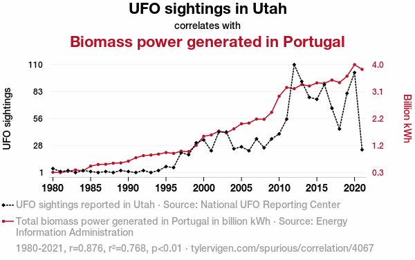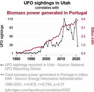 A linear line chart with years as the X-axis and two variables on the Y-axis. The first variable is UFO sightings in Utah and the second variable is Biomass power generated in Portugal.  The chart goes from 1980 to 2021, and the two variables track closely in value over that time. Small Image