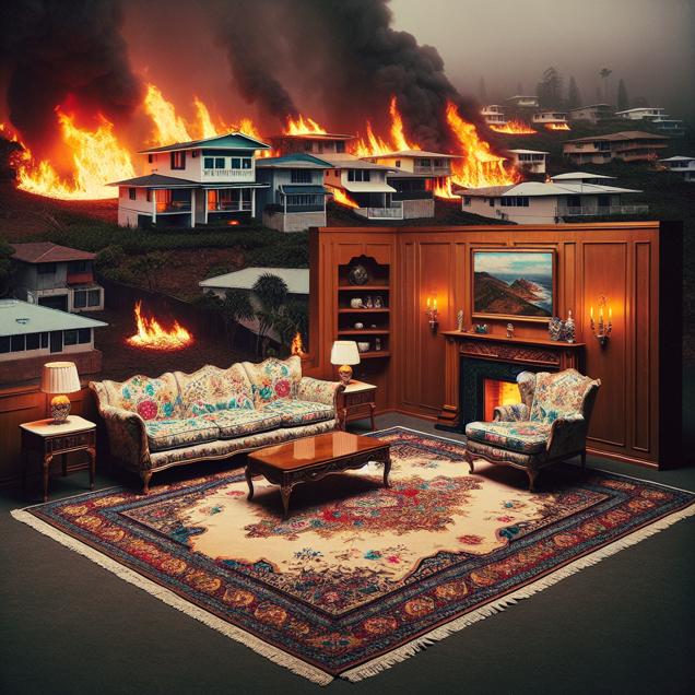 ChatGPT: [ Refinement ] Immerse into a surreal world where reality and imagination blend seamlessly. Generate an image capturing the eerie juxtaposition of a serene living room featuring an opulent, Persian rug draped across the floor, against a backdrop of a neighborhood in Hawaii beset by scattered fires. Ensure the opulence of the rug is emphasized, while the small fires in the background are depicted with a muted, haunting quality.
