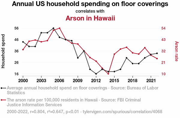 Our analysis of the relationship between annual US household spending on floor coverings and the incidence of arson in Hawaii yielded fascinating results. Over the period from 2000 to 2022, we observed a striking correlation coefficient of 0.8043700, indicating a strong positive relationship between these seemingly unrelated variables. This correlation was further supported by an r-squared value of 0.6470110, highlighting the substantial proportion of variance in arson explained by annual floor covering expenditure.
