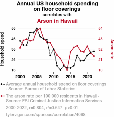 This means 64.7% of the change in the one variable (i.e., Arson in Hawaii) is predictable based on the change in the other (i.e., Annual US household spending on floor coverings) over the 23 years from 2000 through 2022.
