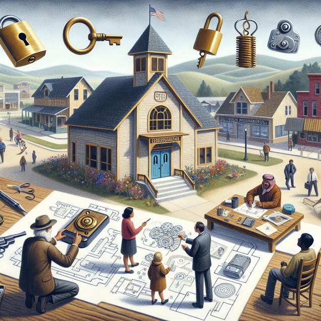 Prompt: [ Whimsical illustration ] Visual Prompt: Generate an image of a quaint Midwestern town in North Dakota, with a charming community hall as the focal point. Surrounding the hall are a diverse group of lively residents huddled around a table, passionately brainstorming ideas and sketching out inventive security systems. In the midst of the conversation, a local inventor enthusiastically presents a new locking mechanism for doors, while another resident demonstrates a clever alarm system. Elsewhere in the town, a few individuals are seen drafting blueprints and diagrams, eagerly filing patent applications with the US Patent Office. The scene should exude a sense of determination and creativity as the community bands together to combat the recent spike in robberies, ultimately resulting in a surge of patents granted in the US. The overall style should be whimsical and heartwarming, capturing the spirit of innovation and camaraderie within the town. The depiction should include only scenes, people, and objects, it should not include text or speech bubbles.