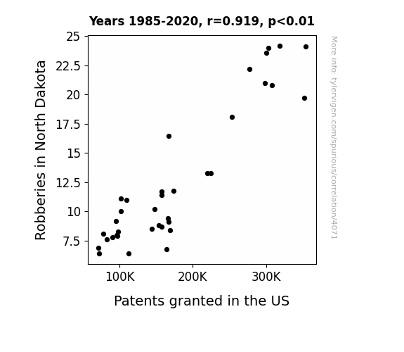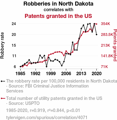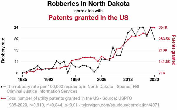 Fig. 1 depicts a scatterplot illustrating the pronounced correlation between robberies in North Dakota and patents granted in the US. The plot vividly conveys the striking relationship between these apparently unrelated phenomena, leaving little room for doubt that something intriguing is afoot.