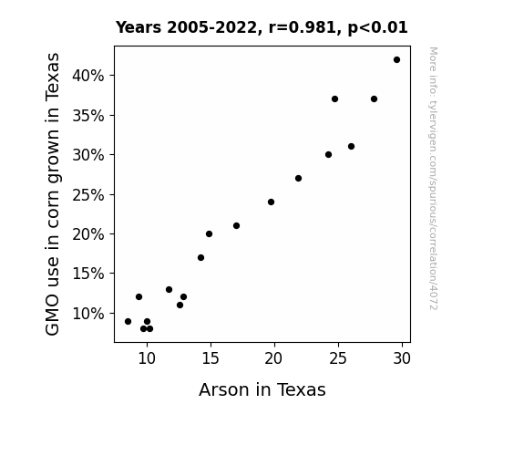 - The spurious research paper: Stalk-ing the Culprit: Unearthing the Correlation between GMO Corn Cultivation in Texas and Arson Cases