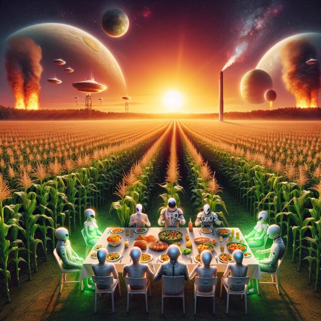 ChatGPT: An image that looks like it is a scene from 'Star Wars': In a vast Texas cornfield, rows of genetically modified corn stand tall in the golden sunlight. As the flames of a wildfire flicker in the distance, the sturdy GMO cornstalks remain untouched. Nearby, a group of individuals enjoying non-GMO enriched diets gather around a wholesome meal, their faces free of temptation and the desire to set fires. Enhanced visual prompt: "Create an otherworldly landscape encompassing a vast Texas cornfield, drenched in the warm glow of a setting sun. Rows of genetically modified corn reach towards the sky, appearing alien-like in their structure and size. A distant wildfire rages, casting an eerie glow on the horizon. Amidst this extraterrestrial scene, a group of individuals, seemingly from a spacefaring civilization, partake in a wholesome meal gathered around a futuristic table, adorned with non-GMO enriched foods. The individuals themselves bear stoic expressions, devoid of desires to cause havoc, and instead radiate an otherworldly sense of peace and contentment."