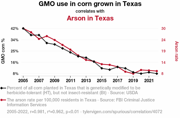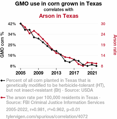 - The spurious research paper: Stalk-ing the Culprit: Unearthing the Correlation between GMO Corn Cultivation in Texas and Arson Cases