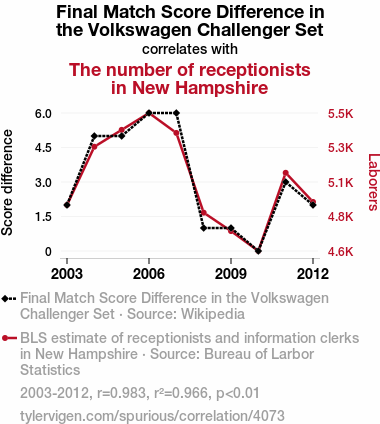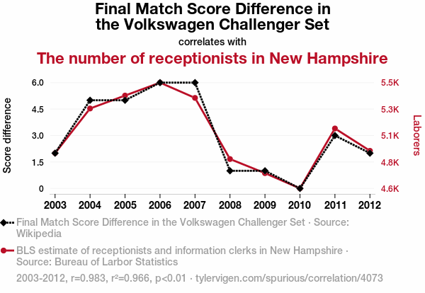 - The spurious research paper: Match Made in Reception: The Quirky Connection Between Final Match Score Difference in the Volkswagen Challenger Set and the Number of Receptionists in New Hampshire