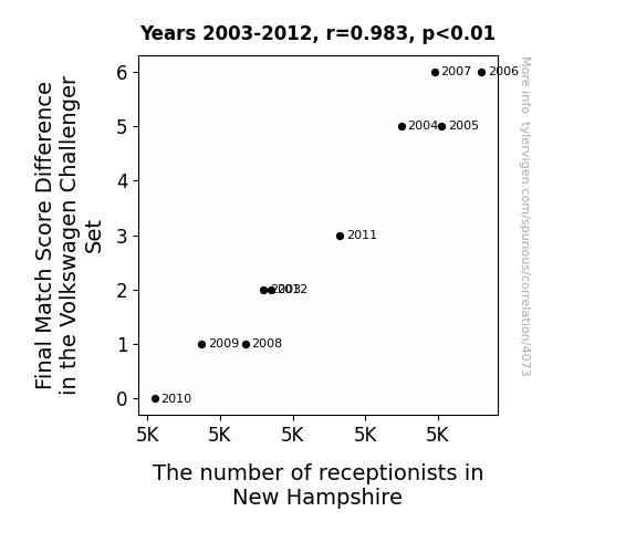 In conclusion, the unexpected and uncanny correspondence between the final match score difference in the Volkswagen Challenger Set and the number of receptionists in New Hampshire, for the years 2003 to 2012, has left us with more questions than answers. The robust correlation coefficient of 0.9829995 has not only defied conventional statistical wisdom but has also added a touch of whimsy to the usually stoic world of research. It's as if the tennis court and the reception desk conspired to create a statistical ballet of sorts, much to the bemusement of our research team.