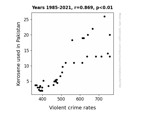 This means 75.5% of the change in the one variable (i.e., Violent crime rates) is predictable based on the change in the other (i.e., Kerosene used in Pakistan) over the 37 years from 1985 through 2021.