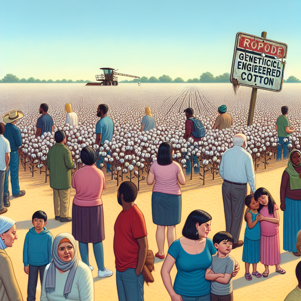 User prompt: Please describe a visual scene that prominently depicts both Popularity of the first name India and GMO use in cotton in Arkansas, in the following situation: As the name India became less popular, there was a corresponding decrease in the demand for Indian cotton. This led to a decrease in the production of cotton in Arkansas, causing a reduced need for GMO cotton. It's a case of as the India name faded, so did the GMO cotton trade! Who would have thought there'd be a connection between baby names and agricultural practices?. Keep the description simple.