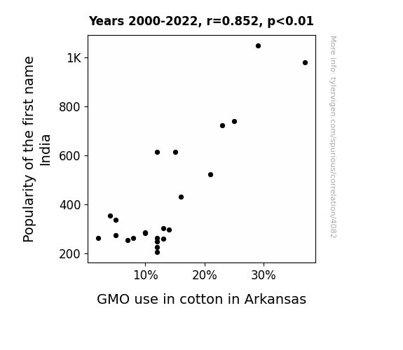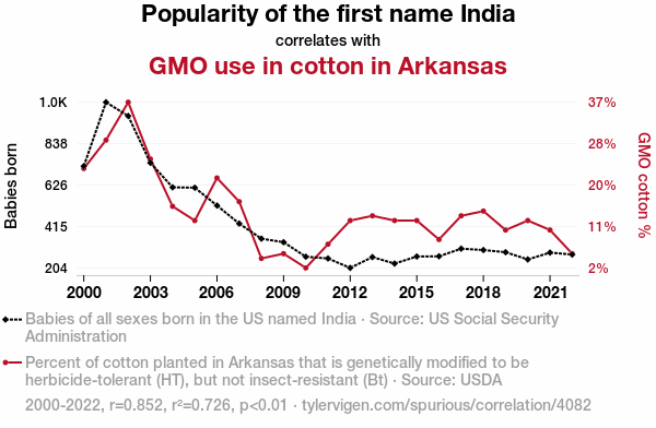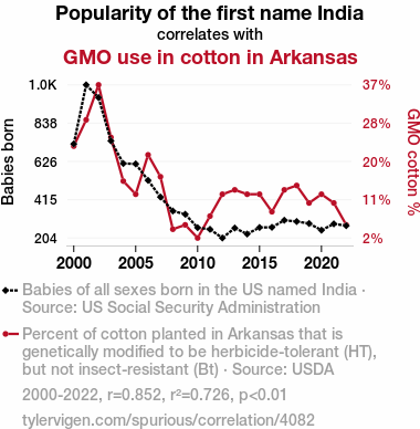 - The spurious research paper: Growing Cotton and Popularity: The Correlation Between the Name India and GMO Adoption in Arkansas