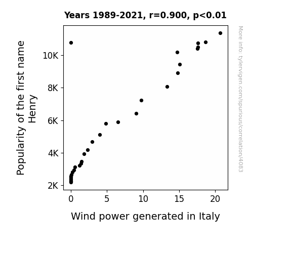 This means 81% of the change in the one variable (i.e., Wind power generated in Italy) is predictable based on the change in the other (i.e., Popularity of the first name Henry) over the 33 years from 1989 through 2021.