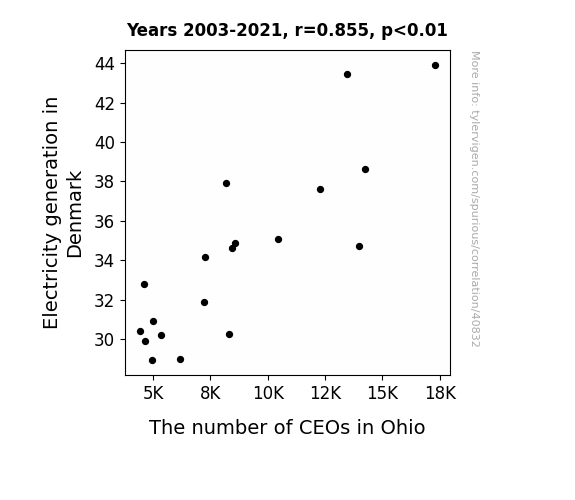 This means 73.1% of the change in the one variable (i.e., The number of CEOs in Ohio) is predictable based on the change in the other (i.e., Electricity generation in Denmark) over the 19 years from 2003 through 2021.
