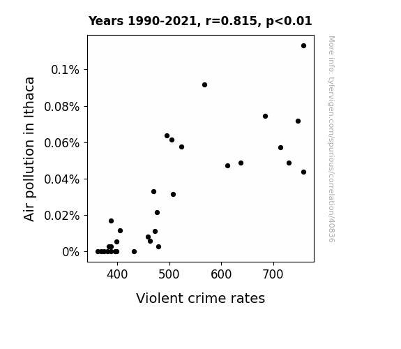 This means 66.5% of the change in the one variable (i.e., Violent crime rates) is predictable based on the change in the other (i.e., Air pollution in Ithaca) over the 32 years from 1990 through 2021.
